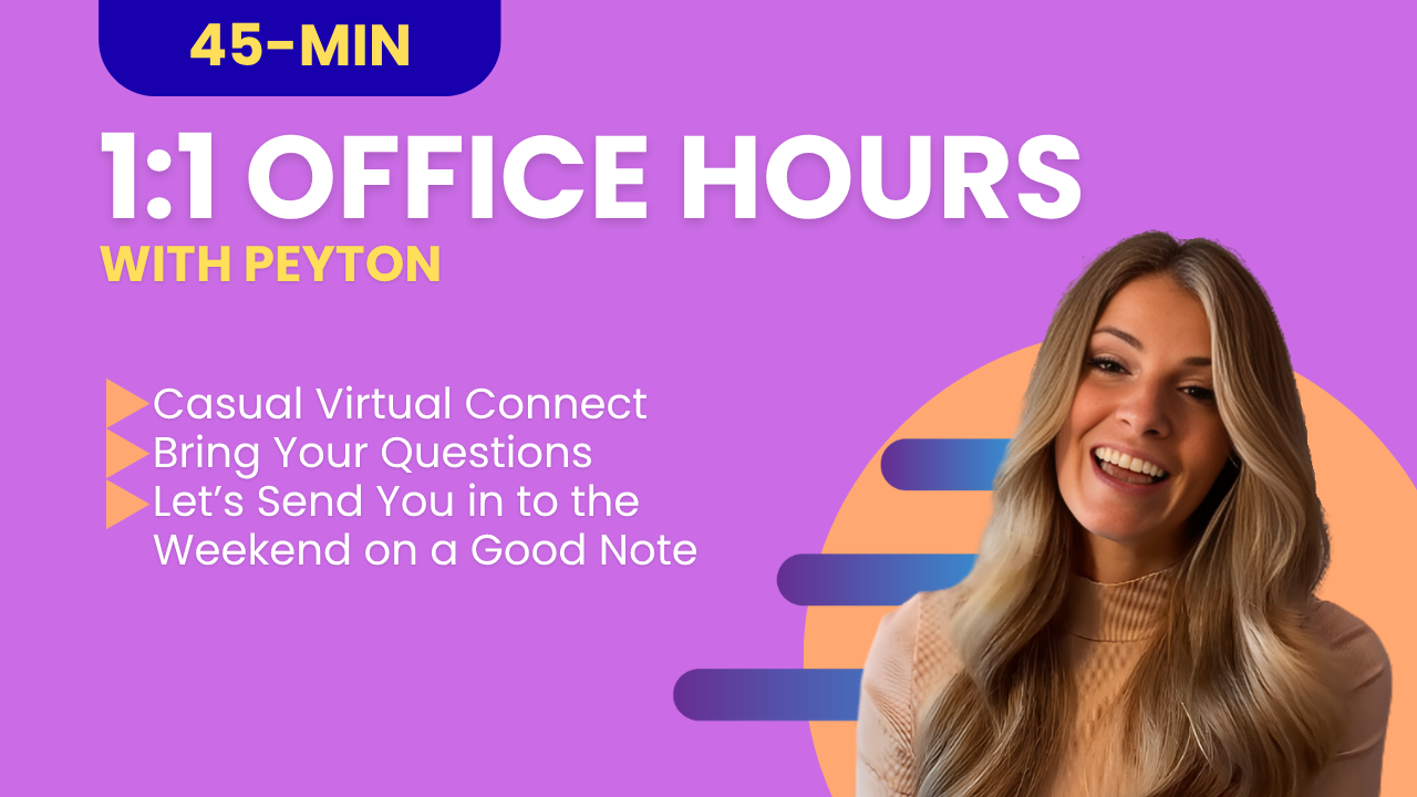 Have a 1-off question, request, or conversation topic for Avolv? You can purchase a 45-Min Office Hours Slot with Peyton, Avolv's Founder during her Office Hour Sessions on Fridays!Ā